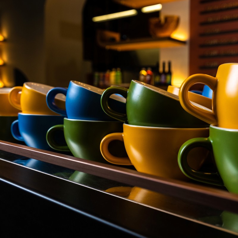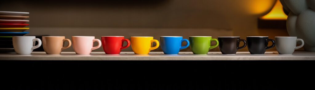 La Linea Tulipano è disponibile in 10 colori opachi in 4 misure differenti, che vanno dai 70cc della caffè ai 300 cc della latte.